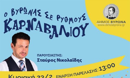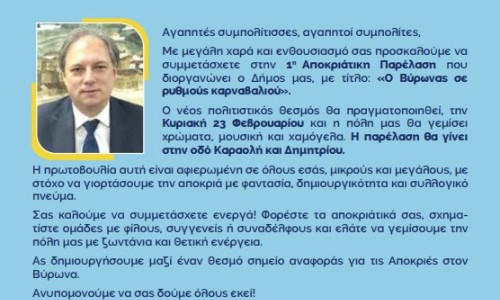 Με ιδιαίτερη χαρά σας ενημερώνουμε ότι ο Δήμος Βύρωνα διοργανώνει την 1η αποκριάτικη παρέλαση με τίτλο “Ο Βύρωνας σε ρυθμούς καρναβαλιού”, την Κυριακή 23 Φεβρουαρίου 2025, με τόπο συγκέντρωσης την παιδική χαρά «Νέας Ελβετίας» στις 12:00 και ώρα έναρξης της παρέλασης 1:00 μ.μ.