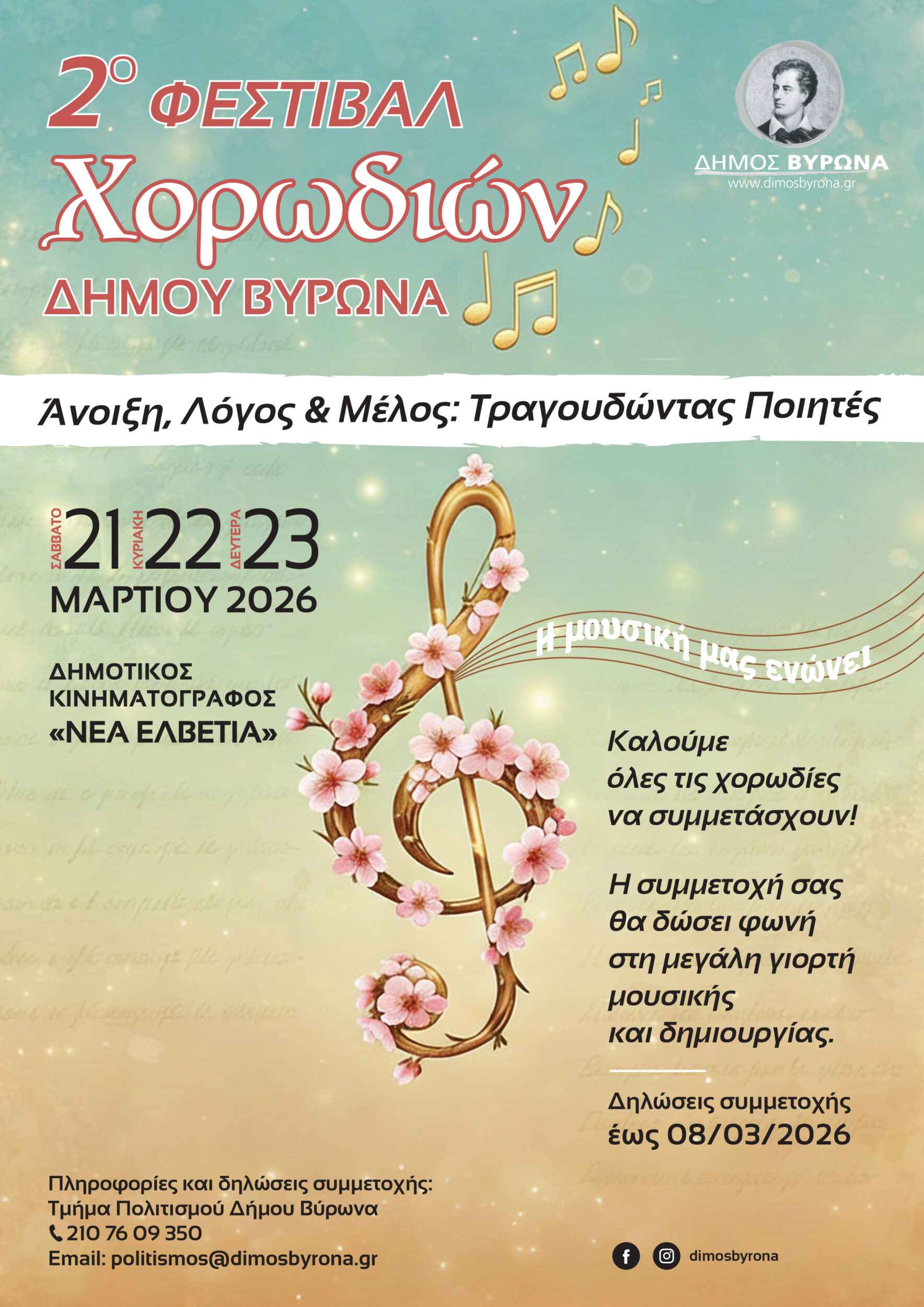 Ο Δήμος Βύρωνα καλεί χορωδίες από όλη την Ελλάδα να δηλώσουν συμμετοχή και να γίνουν μέρος αυτής της γιορτής,  της μουσικής και της ποίησης.