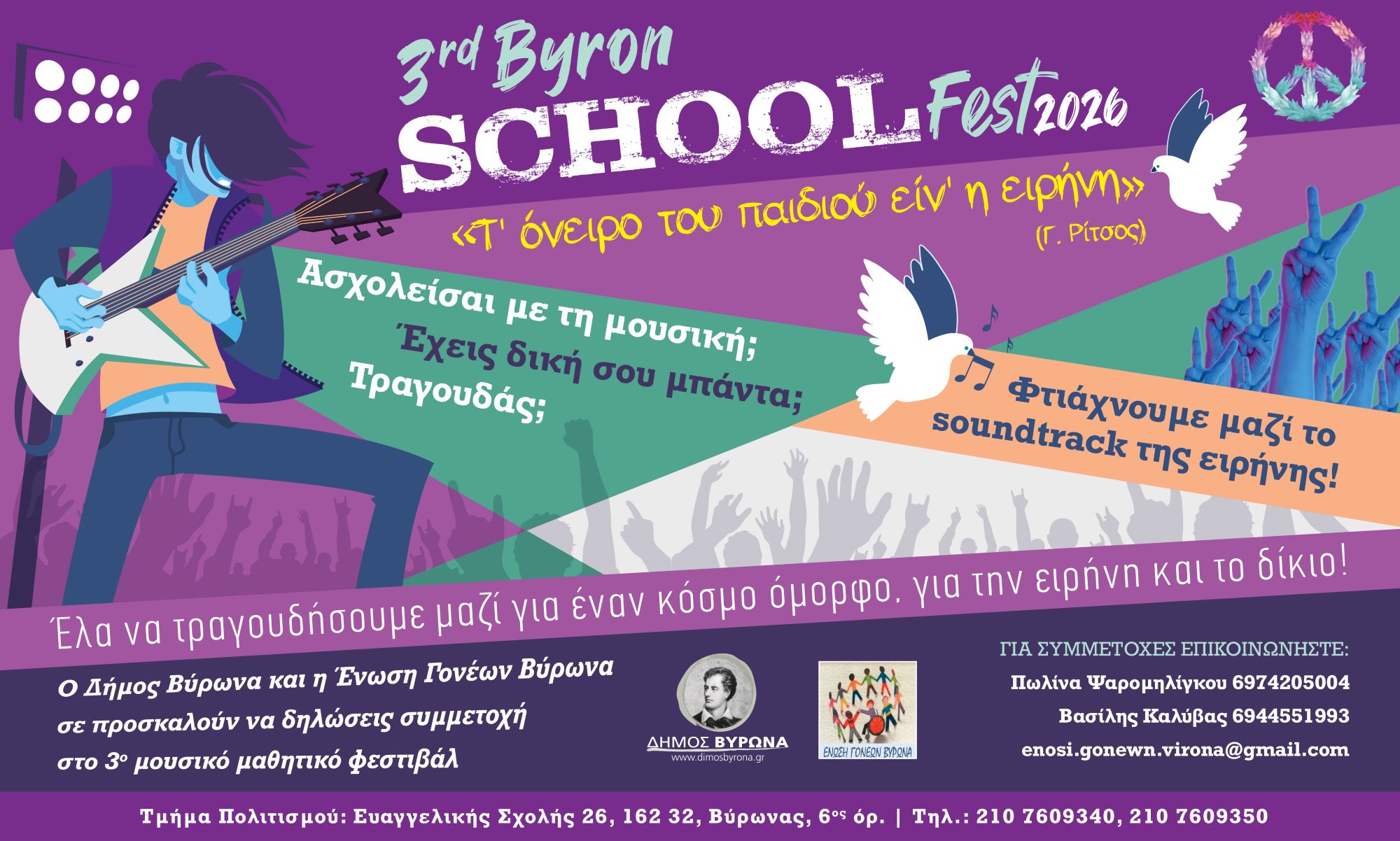 Ο Δήμος Βύρωνα και η Ένωση Γονέων Βύρωνα προσκαλούν μαθητές και μαθήτριες να συμμετάσχουν στο 3ο Μουσικό Μαθητικό Φεστιβάλ Βύρωνα 2026, μια διοργάνωση που έχει ήδη αγαπηθεί πολύ από τη νεολαία της πόλης μας.