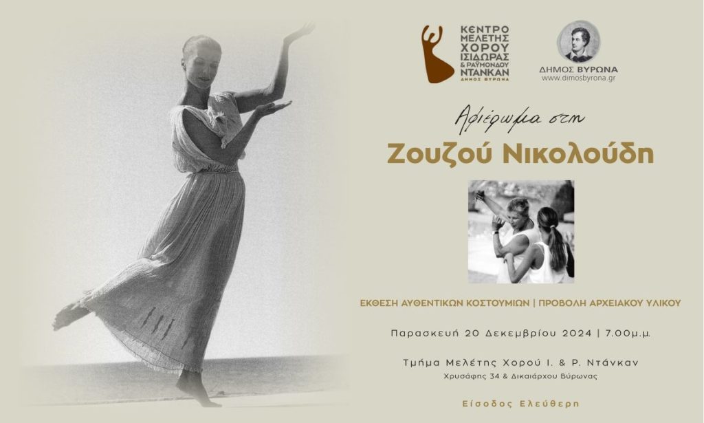 Σας προσκαλούμε την Παρασκευή 20 Δεκεμβρίου 2024 στις 19:00 στο Κέντρο Μελέτης Χορού Ι. και Ρ. Ντάνκαν του Δήμου Βύρωνα (Χρυσάφης 34 και Δικαιάρχου), στην εκδήλωση μνήμης και έμπνευσης όπου μέσα από την έκθεση των αυθεντικών κοστουμιών, την προβολή αρχειακού υλικού και την ανοιχτή συζήτηση με μαθητές και συνεργάτες της, που θα μοιραστούν τις αναμνήσεις τους και την επιρροή της στη ζωή και το έργο τους, θα ανακαλύψουμε ξανά τη φωτεινή κληρονομιά της Ζουζούς Νικολούδη.