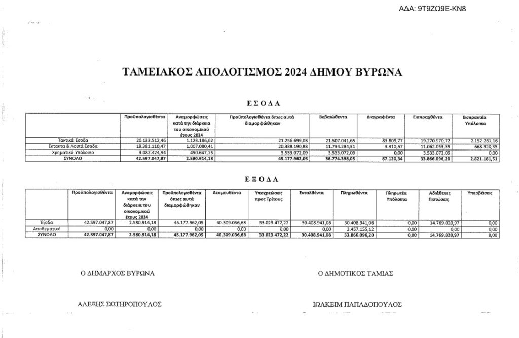 Ανακεφαλαίωση Απολογισμού Δήμου Βύρωνα οικονομικού έτους 2024