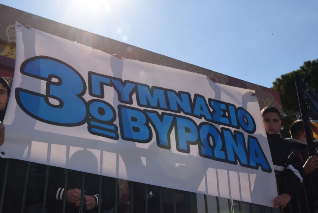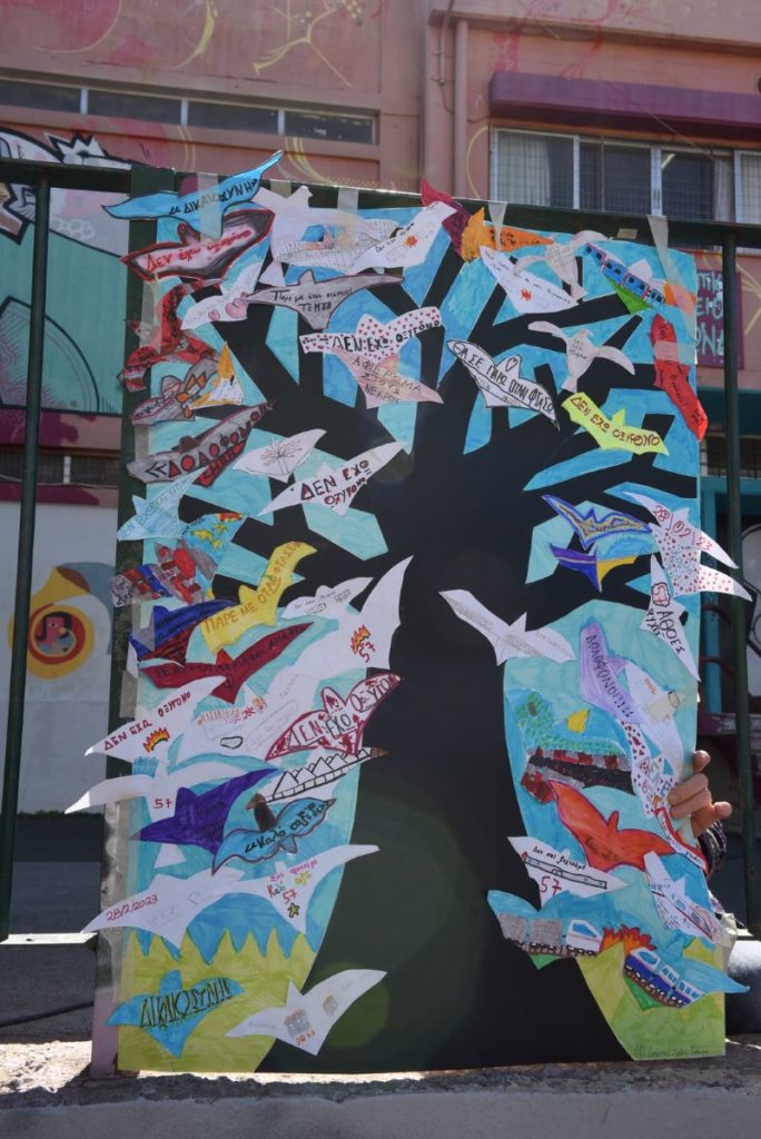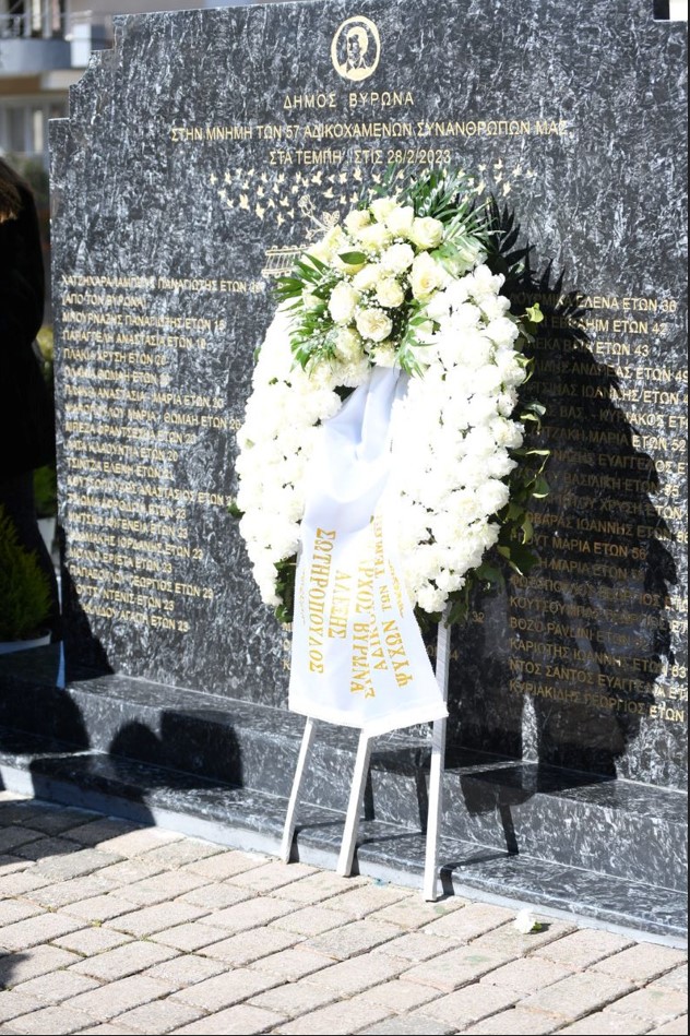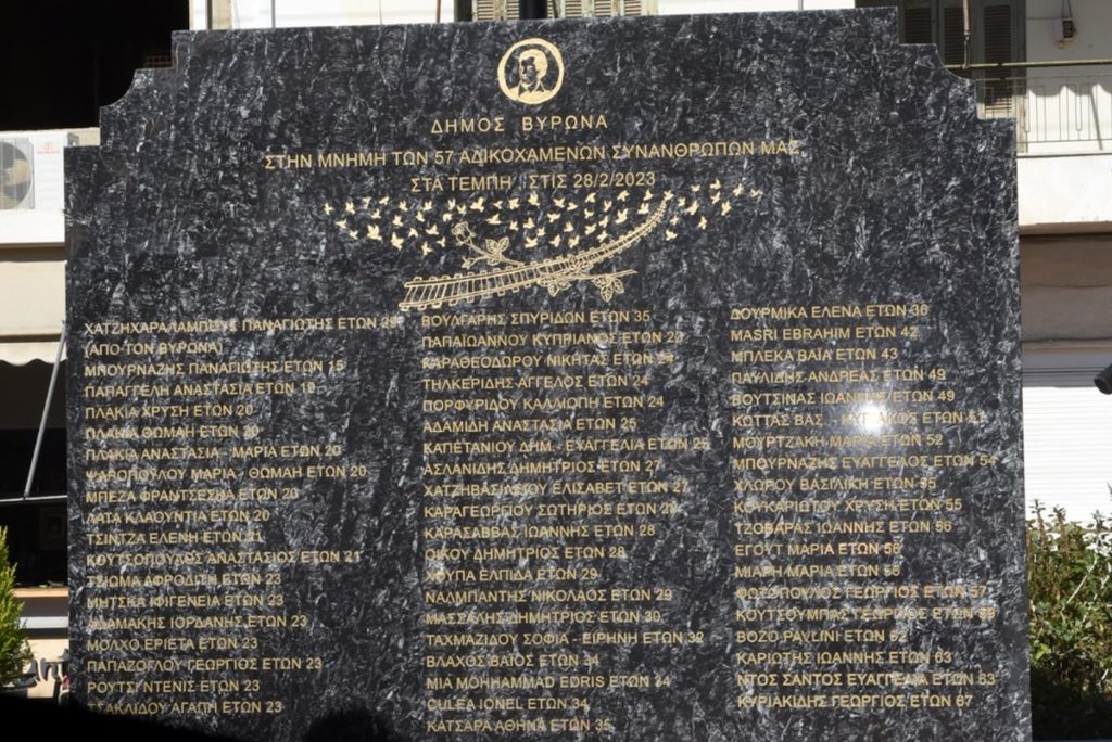 Ο Δήμαρχος Βύρωνα Αλέξης Σωτηρόπουλος και οι συγγενείς των θυμάτων ο κύριος Χατζηχαραλάμπους, η κυρία Βουτσινά και ο κύριος Βούλγαρης, έκαναν τα αποκαλυπτήρια του Μνημείου στην είσοδο των σχολείων 5ου και 11ου Δημοτικών, στη μνήμη των θυμάτων της σιδηροδρομικής τραγωδίας των Τεμπών.