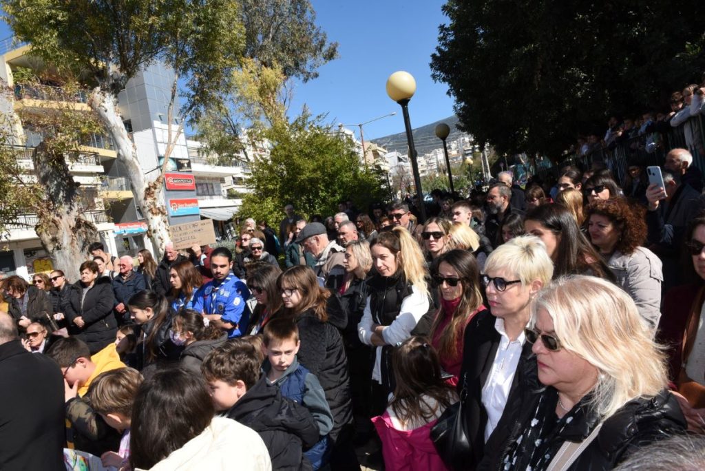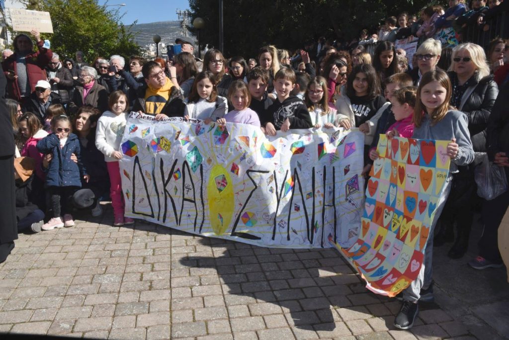 « Όλα τα παιδιά που χάθηκαν στα Τέμπη μεταξύ αυτών και ο Σπύρος, ο γιος μου, και ο Δημήτρης ο Μασσαλής ήταν όλα παιδιά των οικογενειών μας αλλά και παιδιά όλης της Ελλάδος. Ευχαριστούμε από τα βάθη της καρδιάς μας για το πλήθος κόσμου που μαζεύτηκε σε αυτό το συλλαλητήριο. Θέλω να ευχαριστήσω και μέσω των άλλων οικογενειών τον Δήμαρχο Αλέξη Σωτηρόπουλο για το μνημείο που κάνατε για τα παιδιά μας και όπως είπα είναι όλα παιδιά της Ελλάδος. Θρήνησε η Ελλάδα από παντού στο εσωτερικό και στο εξωτερικό. Όλες οι οικογένειές των θυμάτων θα παραμείνουμε ενωμένοι γιατί ζητάμε να βγει η αλήθεια στο φως, όσο ψηλά και να βρίσκεται για να μάθουμε πως χαθήκαν εκείνο το βράδυ αυτές οι ψυχές των παιδιών μας. Θα ήθελα να κλείσω με το έξης, οι φίλοι του γιου μου από το χωριό του, το Λιανοκλάδι που εκεί σπούδασε και δούλεψε είχαν κάνει ένα ωραίο ποίημα και πιστεύω ότι αντιπροσωπεύει όλα τα παιδιά, όπου πετούν οι αετοί ψηλά και ταξιδεύουν, πηγαίνουν οι σκέψεις μας συχνά και σας γυρεύουν, εκεί στα σύννεφα ψηλά και στου Θεού το κάστρο Άγγελοι γίνατε και εσείς και το δικό μας άστρο.»