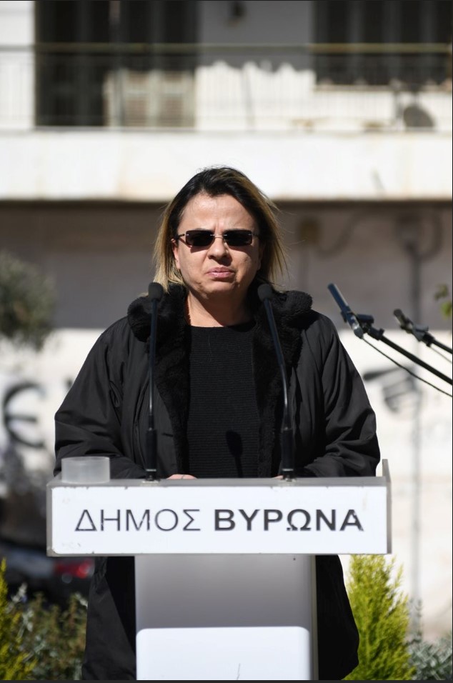 «Για αρχή θα ήθελα να ευχαριστήσω όλο το Δημοτικό Συμβούλιο, το οποίο ομόφωνα πήρε αυτήν την απόφαση για το μνημείο. Να ευχαριστήσω τον Δήμαρχο Βύρωνα Αλέξη Σωτηρόπουλο που πραγματοποίησε αυτό το μνημείο. Ο Δήμος Βύρωνα είναι ο πρώτος Δήμος που κάνει μνημείο για τα Τέμπη, αν αφαιρέσουμε την Αθήνα και την Θεσσαλονίκη που παραχώρησαν τον χώρο και νιώθω υπερήφανος που μένω στον Βύρωνα. Τα Τέμπη γράψανε ιστορία για δύο λόγους, αφενός γιατί κατάφεραν αυτήν την παλλαϊκή συγκέντρωση, η οποία ένωσε όλους τους Έλληνες απανταχού και στο εσωτερικό και στο εξωτερικό και αφετέρου τα παιδιά μας τα σκοτώσανε δύο φορές. Την πρώτη φορά τους πήρανε την ζωή και την δεύτερη φορά συλήσανε πάνω στα κορμιά τους.»
