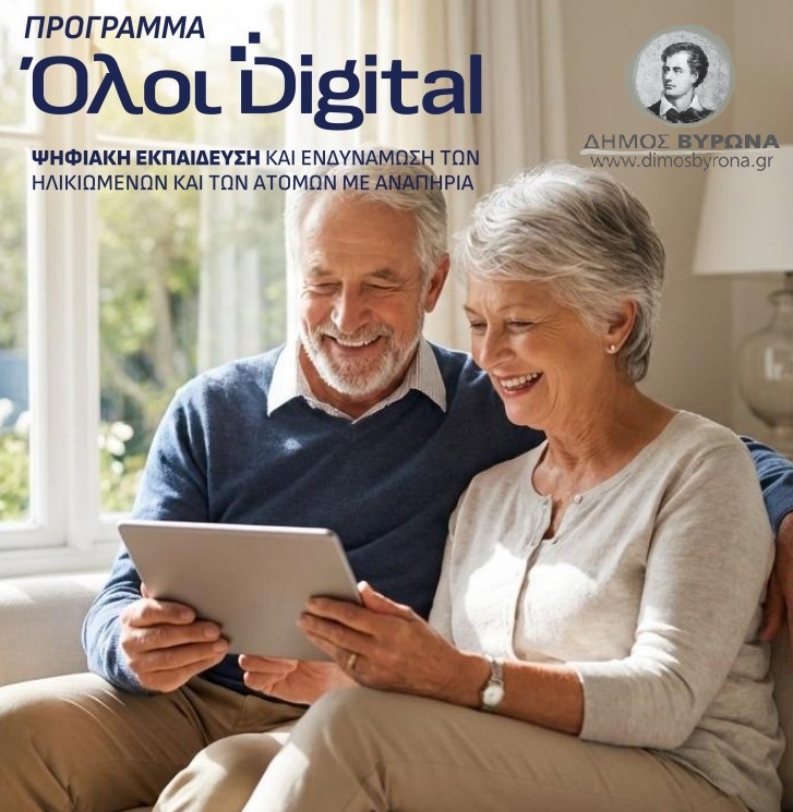 Ο Δήμος Βύρωνα συμμετέχει στο πρόγραμμα «Όλοι Digital» για την Ψηφιακή Ενδυνάμωση Ηλικιωμένων και των Ατόμων με Αναπηρία. Το πρόγραμμα…