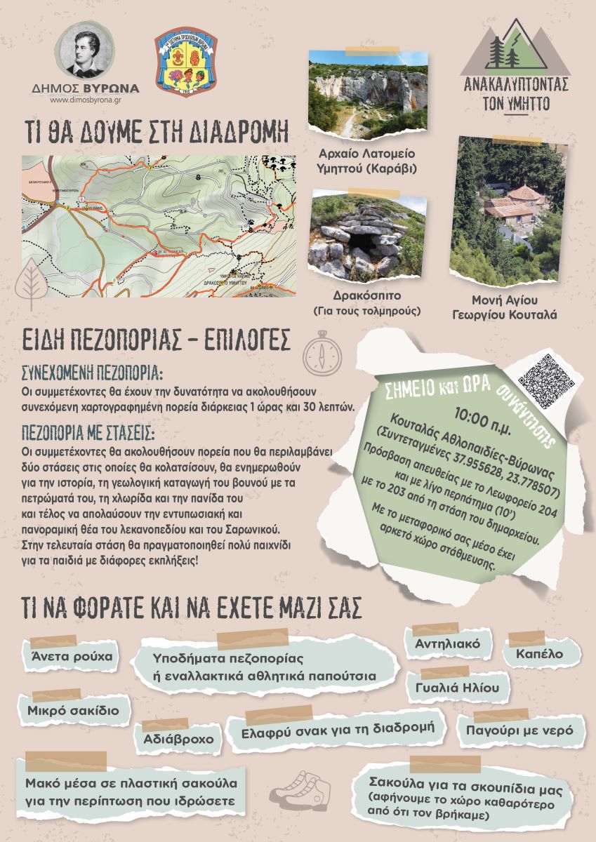 Ο Δήμος Βύρωνα, σε συνεργασία με το 2ο Σύστημα Προσκόπων Βύρωνα, διοργανώνει για πρώτη φορά μια μοναδική πεζοπορική δράση στον Υμηττό με τίτλο «Ανακαλύπτοντας τον Υμηττό», προσκαλώντας δημότες όλων των ηλικιών να γνωρίσουν τη φύση, την ιστορία και τα μονοπάτια του βουνού.