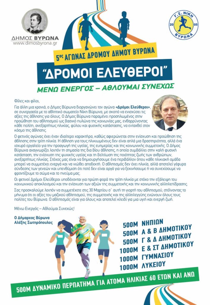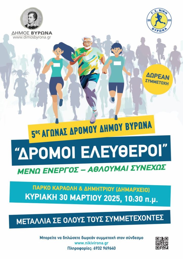 Για πέμπτη φορά ο Δήμος Βύρωνα, σε συνεργασία με τον Γυμναστικό Σύλλογο Νίκη Βύρωνα, διοργανώνει την Κυριακή 30 Μαρτίου 2025 τον αγώνα “ΔΡΟΜΟΙ ΕΛΕΥΘΕΡΟΙ”.
