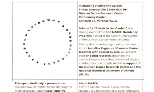 Σας προσκαλούμε στην «Επίσκεψη στον Κήπο», την καταληκτική εκδήλωση του πρώτου προγράμματος φιλοξενίας καλλιτεχνών του ευρωπαϊκού προγράμματος MATCΗ, που πραγματοποιείται με την υποστήριξη του Duncan Dance Research Center του Δήμου Βύρωνα και του Εθνικού Μετσόβιου Πολυτεχνείου (ΕΜΠ).