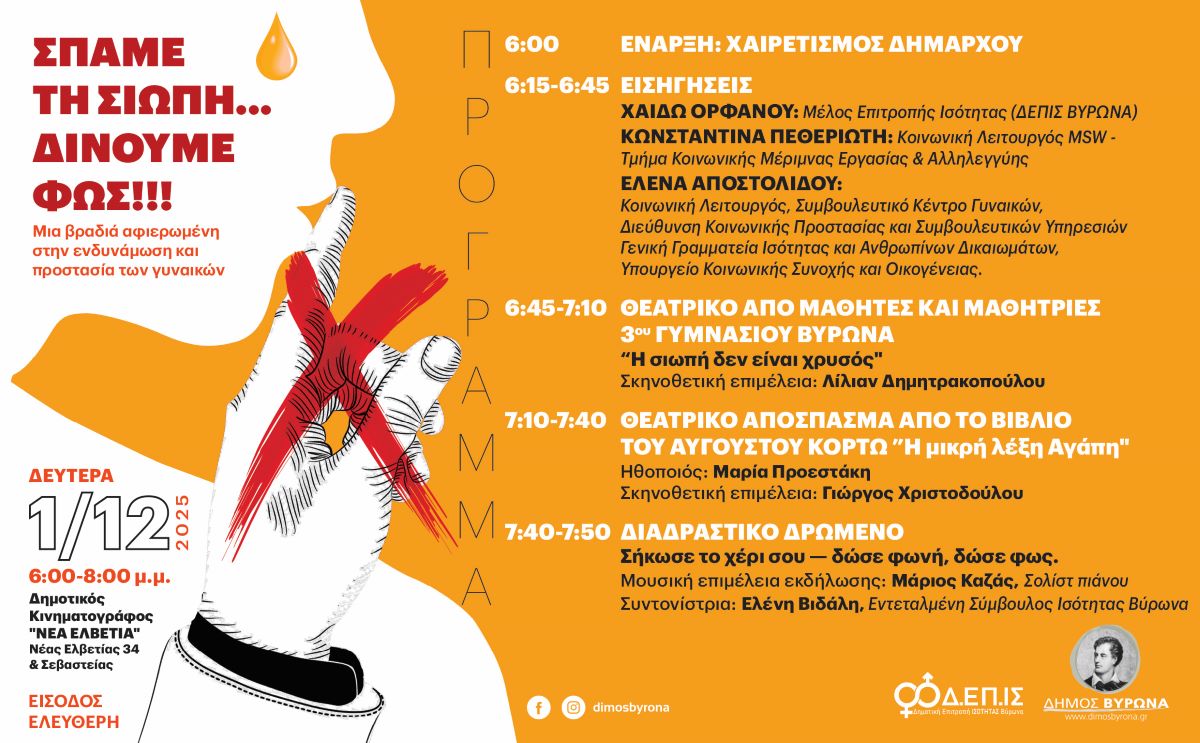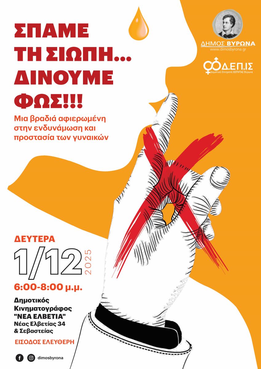 Με αφορμή την Παγκόσμια Ημέρα για την Εξάλειψη της Βίας κατά των Γυναικών, o Δήμος Βύρωνα και η Επιτροπή Ισότητας Δήμου Βύρωνα (ΔΕΠΙΣ) σας προσκαλούν τη Δευτέρα 1 Δεκεμβρίου 2025, ώρα 18:00, στον Δημοτικό Κινηματογράφο “Νέα Ελβετία”, σε μια ανοιχτή εκδήλωση αφιερωμένη στην ενδυνάμωση των γυναικών και την προώθηση των ανθρωπίνων δικαιωμάτων