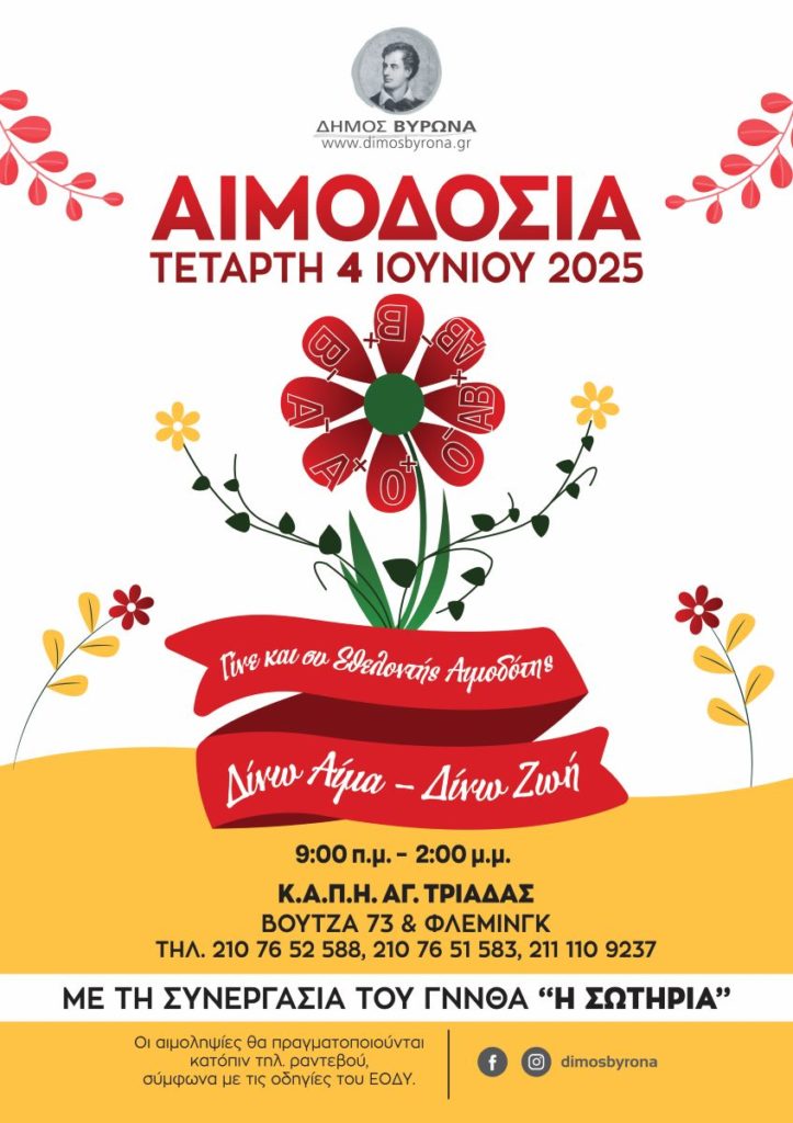 Τετάρτη, 4 Ιουνίου 2025 και από τις 09:00 – 14:00 στο Κ.Α.Π.Η. Αγίας Τριάδας (Βουτζά 73 & Φλέμινγκ, Εντευκτήριο Προσκόπων), ο Δήμος Βύρωνα, σε συνεργασία με το Γενικό Νοσοκομείο “Η ΣΩΤΗΡΙΑ”, σας προσκαλεί να ξεκινήσουμε το καλοκαίρι με μια πράξη ζωής.