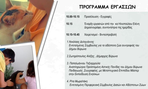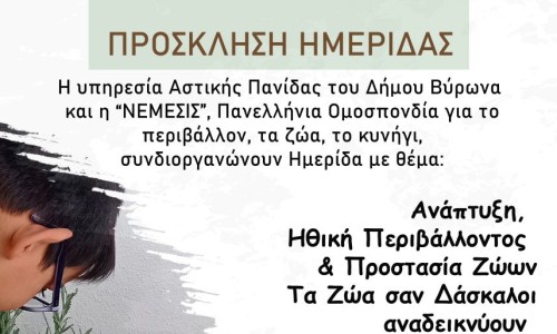 Η υπηρεσία Αστικής Πανίδας του Δήμου Βύρωνα και η «ΝΕΜΕΣΙΣ», Πανελλήνια Ομοσπονδία για το περιβάλλον, τα ζώα, το κυνήγι, συνδιοργανώνουν Ημερίδα με θέμα: