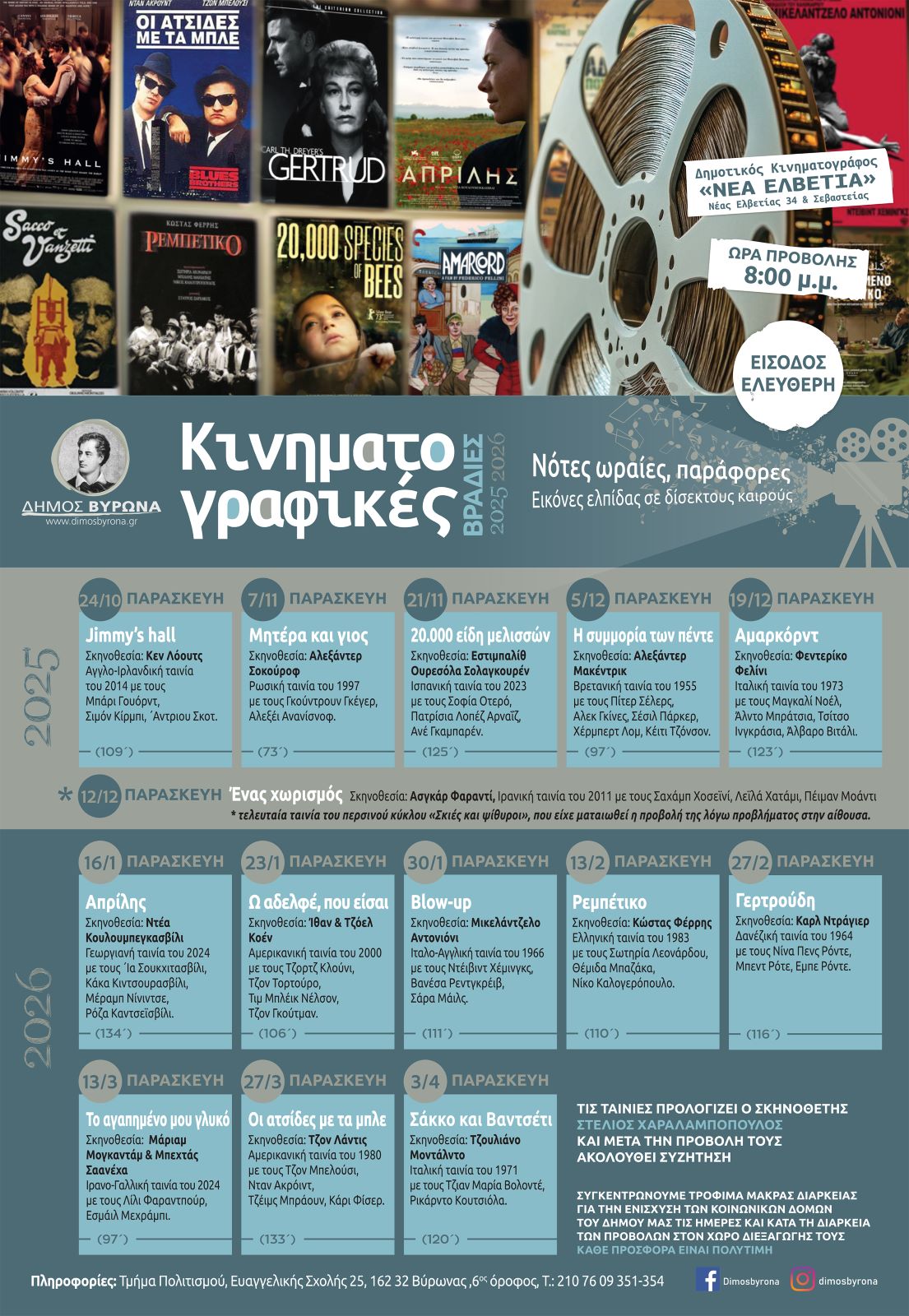 Συνεχίζονται οι Κινηματογραφικές βραδιές του Δήμου Βύρωνα με το νέο κύκλο προβολών:«Νότες ωραίες, παράφορες» Εικόνες ελπίδας σε δίσεκτους καιρούς, την Παρασκευή 27.3.2026, με την προβολή της ταινίας Οι ατσίδες με τα μπλε.