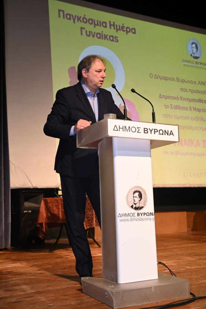 Την τιμητική αυτή βραδιά άνοιξε ο Δήμαρχος  Βύρωνα Αλέξης Σωτηρόπουλος με χαιρετισμό στους παρευρισκόμενους, αναφερόμενος στην ιστορική καθιέρωση της 8ης Μαρτίου ως Παγκόσμια Ημέρα Γυναίκας αλλά και στη συμβολή των γυναικών σε όλους τους τομείς της δημόσιας ζωής. Στη συνέχεια τόνισε: