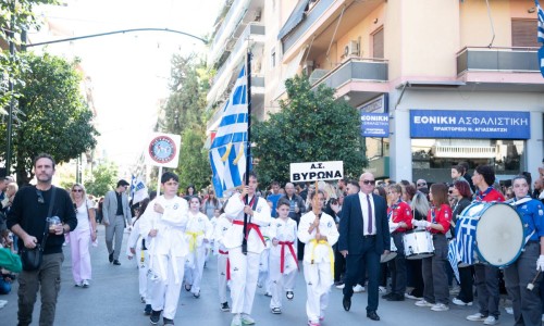 Στη συνέχεια, ο Δήμαρχος Βύρωνα, εκφώνησε τον πανηγυρικό της ημέρας και ακολούθησε η καθιερωμένη παρέλαση μαθητών, πολιτιστικών και αθλητικών συλλόγων της πόλης μας, στην οδό Χρυσοστόμου Σμύρνης.