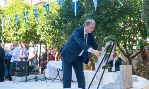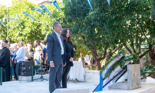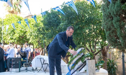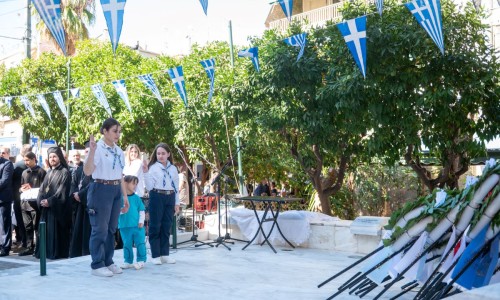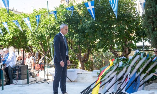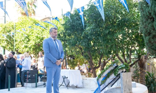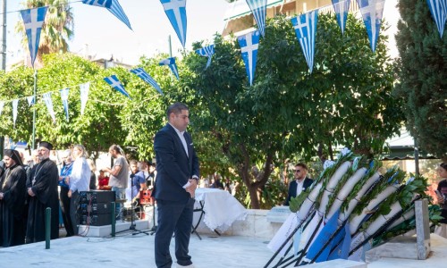 Και θέλω απευθυνόμενος στην νεολαία που θα παρελάσει σε λίγο υπερήφανα ενώπιον μας να τους πω ότι : Εσείς είστε το μέλλον αυτού του τόπου και πρέπει να θυμάστε ότι τα ιδανικά του ’40 δεν ανήκουν στο παρελθόν. Ζουν κάθε φορά που κάποιος στέκεται όρθιος απέναντι στο άδικο, κάθε φορά που υπερασπίζεται την αλήθεια, κάθε φορά που παλεύει για το κοινό καλό, για την ειρήνη, για την ελπίδα. Η ιστορία δεν ζητά από εμάς να γίνουμε ήρωες του βουνού, αλλά να γίνουμε ήρωες της καθημερινότητας — με ήθος, με ευθύνη, με συμμετοχή, με σεβασμό στον διπλανό μας, την ελευθερία, την δικαιοσύνη και τη δημοκρατία.