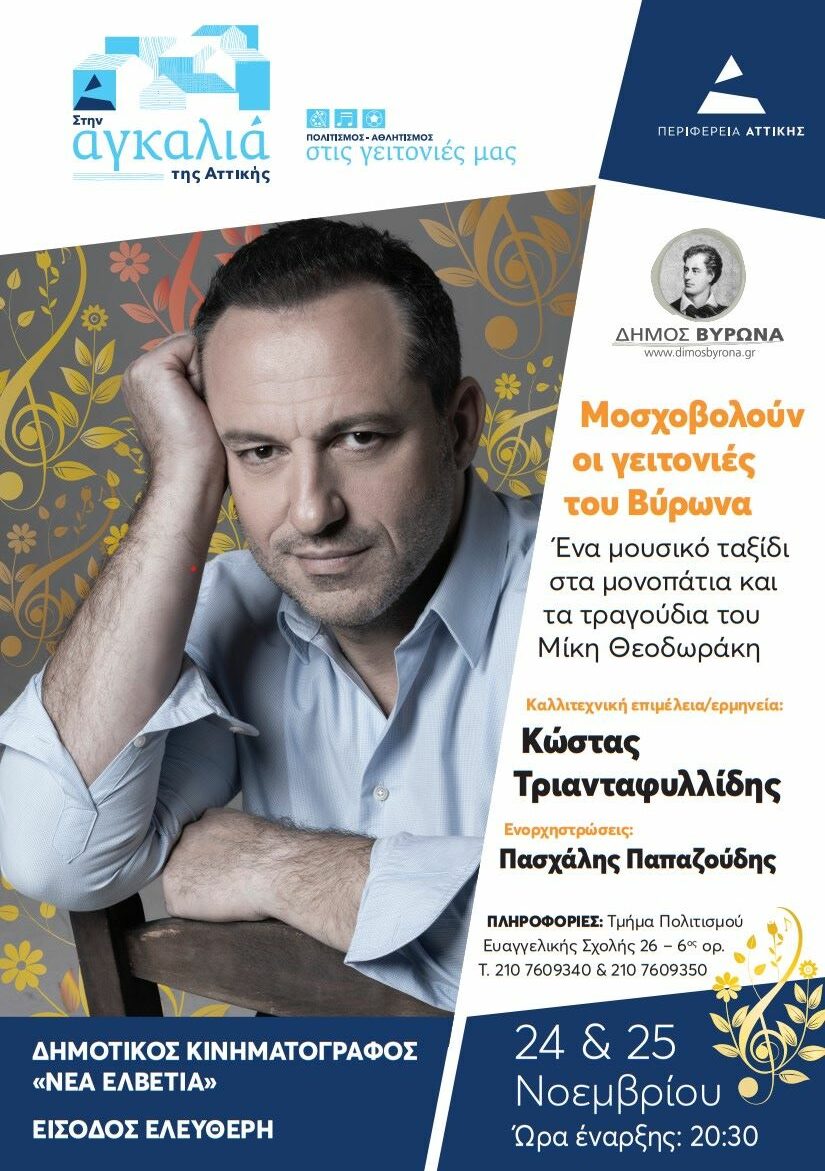 Η Περιφέρεια Αττικής και ο Δήμος Βύρωνα συνδιοργανώνουν τη μουσική παράσταση «Μοσχοβολούν οι γειτονιές του Βύρωνα», ένα αφιέρωμα στα 100 χρόνια από τη γέννηση του μεγάλου Έλληνα δημιουργού Μίκη Θεοδωράκη.