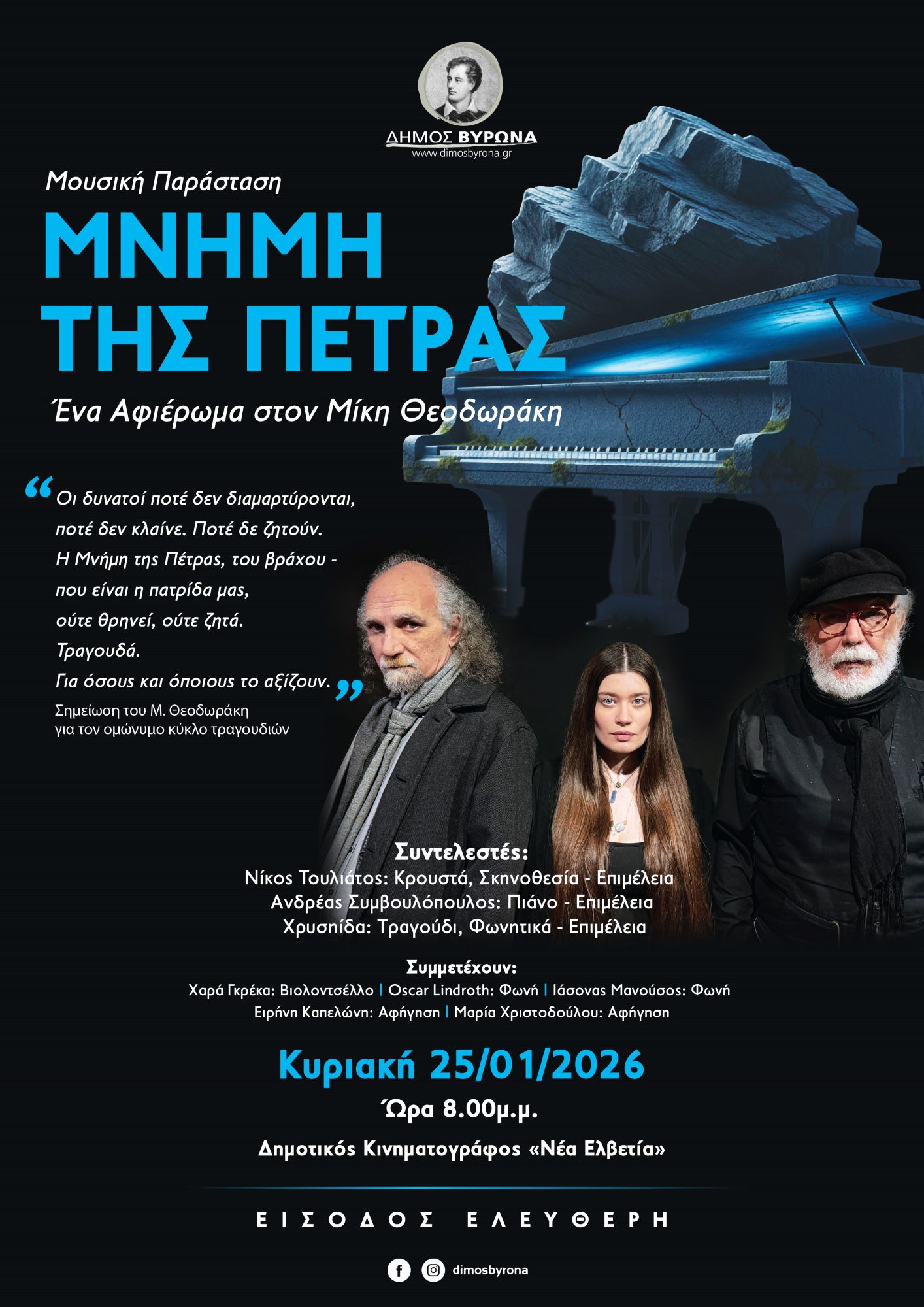 Ο Δήμος Βύρωνα παρουσιάζει τη μουσική παράσταση «Μνήμη της Πέτρας», ένα λιτό και βαθιά συγκινητικό αφιέρωμα στον Μίκη Θεοδωράκη, βασισμένο στον ομώνυμο κύκλο τραγουδιών του. Μέσα από μουσική, τραγούδι και αφήγηση, αναδεικνύεται η δύναμη της μνήμης, της πατρίδας και της συλλογικής συνείδησης.