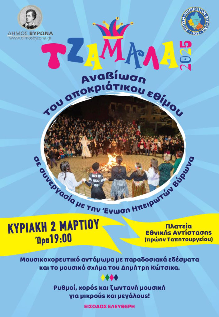 Την Κυριακή 2 Μαρτίου 2025 στις 19:00 στην Πλατεία Εθνικής Αντίστασης (Ταπητουργείο) θα ζήσουμε από κοντά την αναβίωση του παραδοσιακού ηπειρώτικου εθίμου της “Τζαμάλας”.
