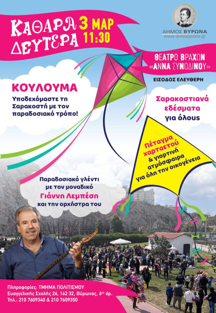 Την Καθαρά Δευτέρα 3 Μαρτίου 2025 από τις 11:30 π.μ. σας περιμένουμε στο Θέατρο Βράχων “Άννα Συνοδινού” για να γιορτάσουμε τα Κούλουμα με παραδοσιακά σαρακοστιανά εδέσματα, όπως φασολάδα, χαλβά και λαγάνα, και φυσικά, με το πέταγμα του χαρταετού.