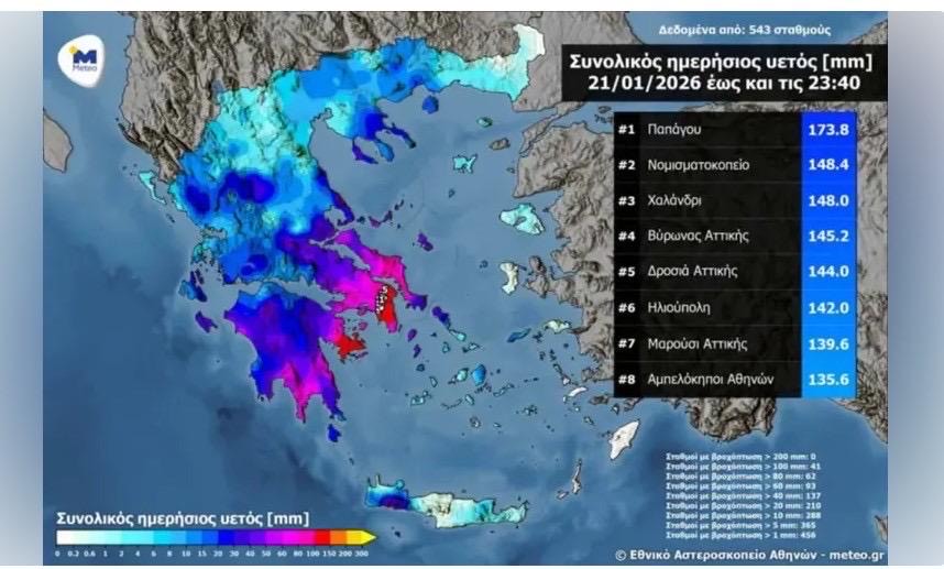 4η θέση στην Αττική σε συνολικό ημερήσιο ύψος υετού. Μέσα σε ένα