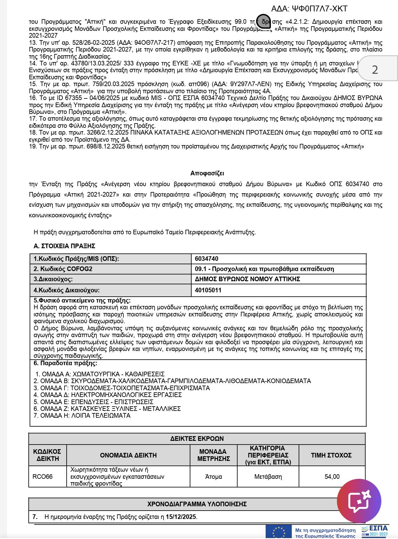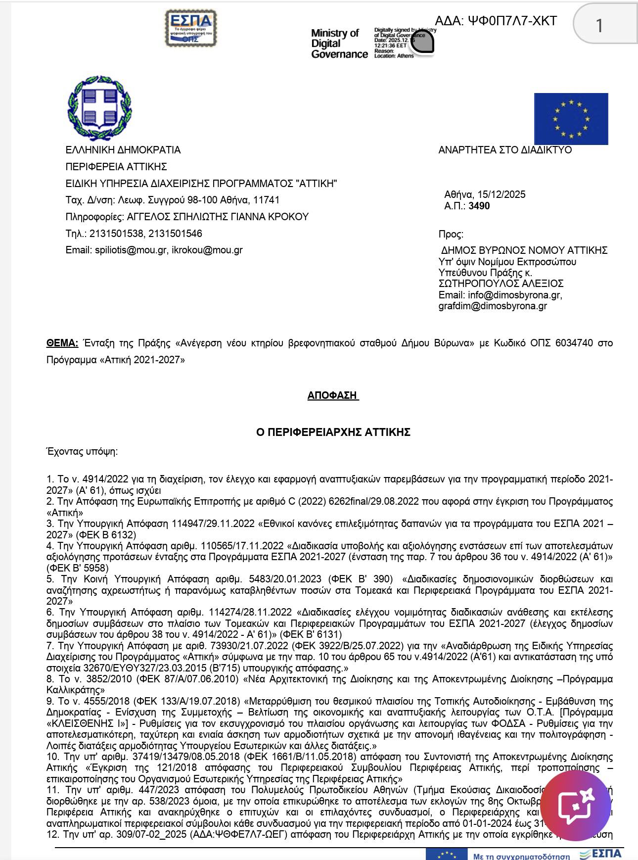Η ένταξή του υπεγράφη από τον Περιφερειάρχη Αττικής τη Δευτέρα 15 Δεκεμβρίου 2025, παρουσία του Δημάρχου Βύρωνα, Αλέξη Σωτηρόπουλου, μετά την αξιολόγηση και έγκριση της σχετικής αίτησης του Δήμου από την αρμόδια Ειδική Υπηρεσία Διαχείρισης.