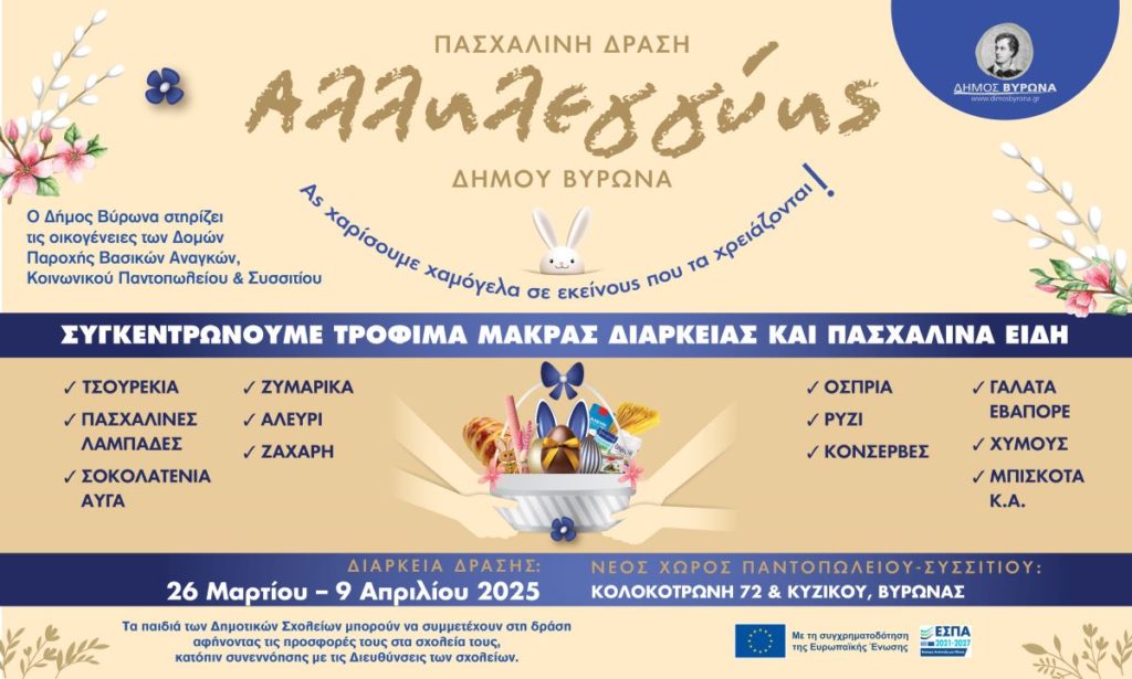 Ο Δήμος Βύρωνα, σε συνεργασία με τις Δομές Παροχής Βασικών Αναγκών: Κοινωνικό Παντοπωλείο & Συσσίτιο, της Διεύθυνσης Κοινωνικής Πολιτικής & Υγείας, οργανώνει δράση αλληλεγγύης για την ενίσχυση των οικογενειών που βρίσκονται σε ανάγκη εν όψει των εορτών του Πάσχα. Η δράση στοχεύει στο να προσφέρει ένα ευχάριστο και γεμάτο ελπίδα Πάσχα στις ευάλωτες οικογένειες του Δήμου μας, καλώντας τους συμπολίτες μας να συνεισφέρουν με τρόφιμα μακράς διάρκειας και πασχαλινά είδη.