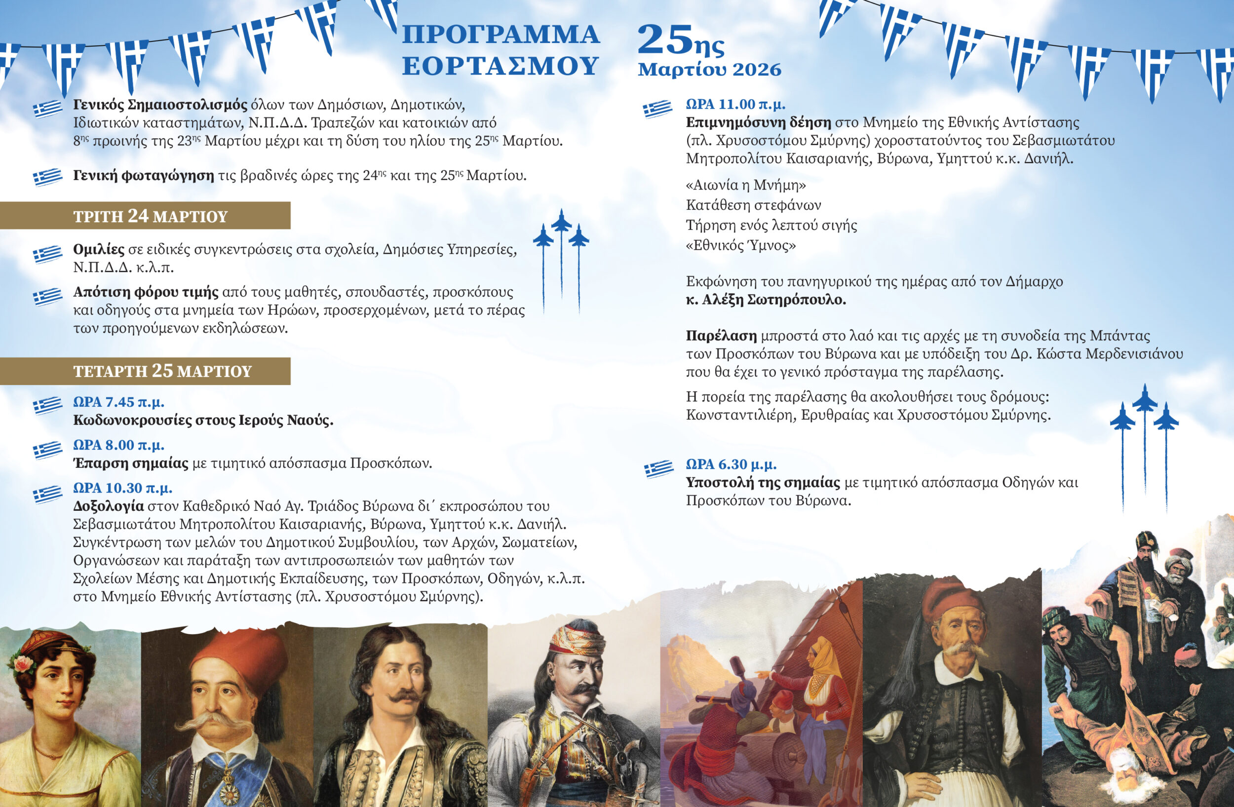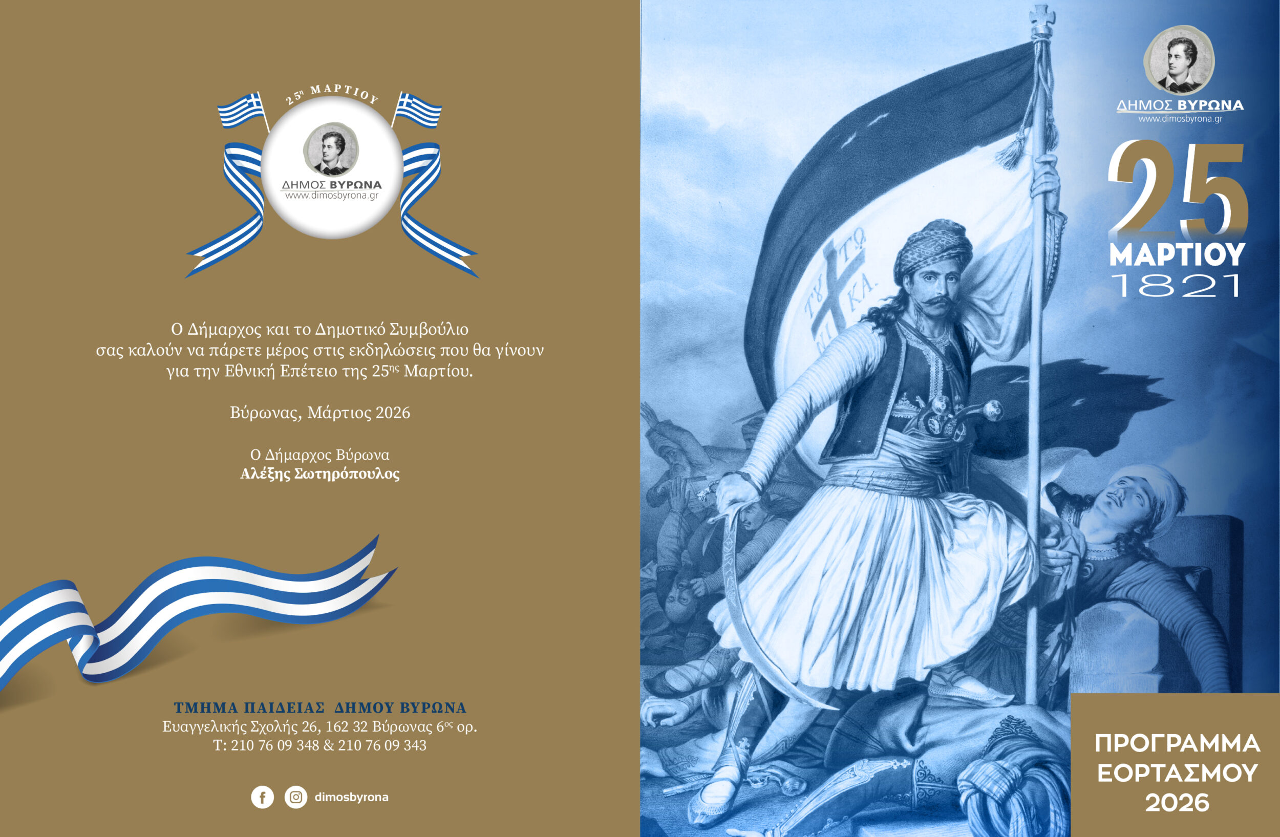 Ο Δήμαρχος Βύρωνα Αλέξης Σωτηρόπουλος και το Δημοτικό Συμβούλιο σας καλούν να πάρετε μέρος στις εκδηλώσεις που θα γίνουν για την Εθνική Επέτειο της 25ης Μαρτίου.