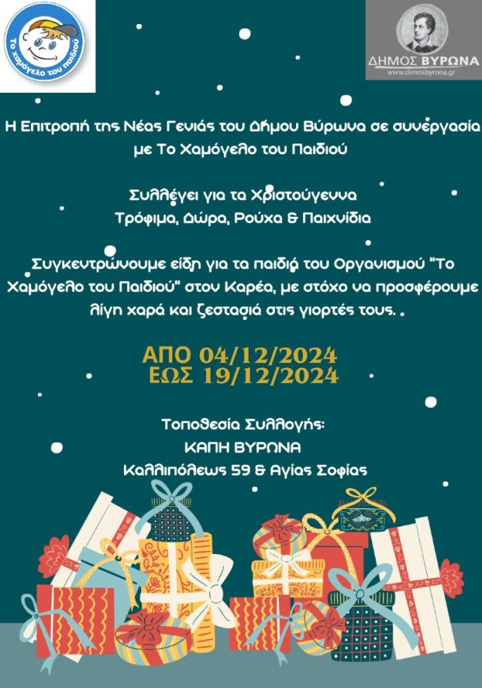Η Επιτροπή Νέας Γενιάς του Δήμου Βύρωνα σε συνεργασία με το « Χαμόγελο του Παιδιού», συλλέγει για τα Χριστούγεννα δώρα, ρούχα και παιχνίδια για παιδιά έως 18 ετών, από τις